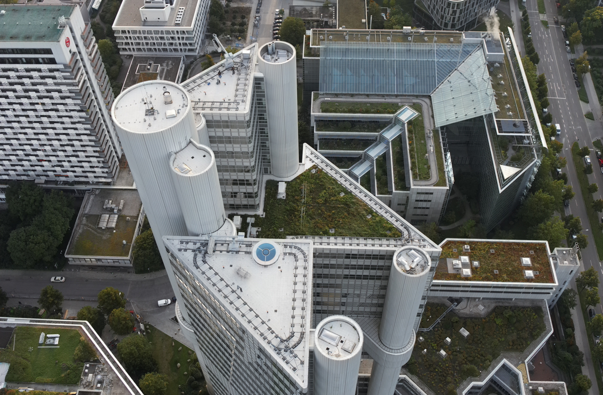 Der HVB Tower in München. Sichtbar von der Autobahn und markant am Arabellapark. Ein tolles Gebäude mit beeindruckender Architektur. Außen an den Towern sind Paneele aus Aluminium angebracht – sehr viele Paneele.